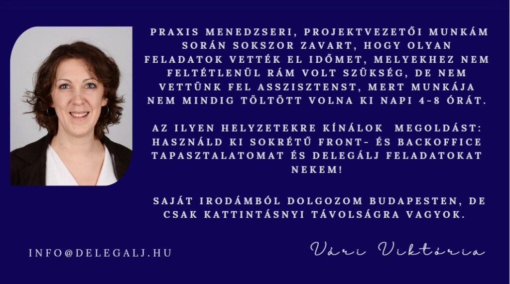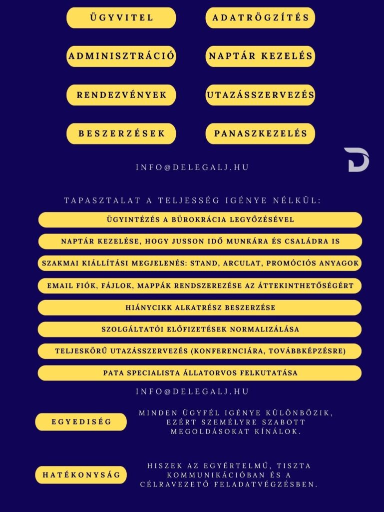 Irodai feladatok, adminisztráció, ügyvitel, levelezés, naptár kezelés, utazás- és rendezvényszervezés, beszerzés.